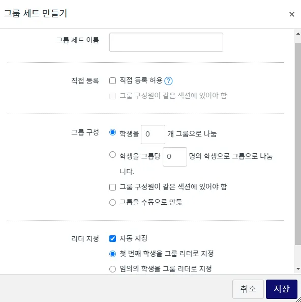 '첫 번째 학생을 그룹 리더로 지정' : 이 옵션은 그룹에 참여한 첫 번째 학생을 그룹 리더로 지정합니다.