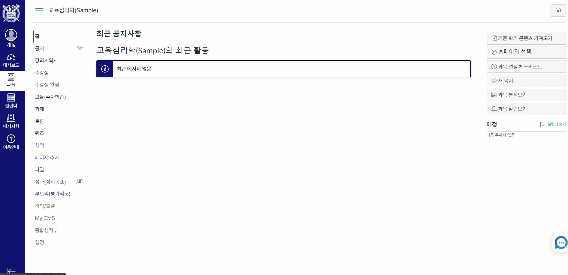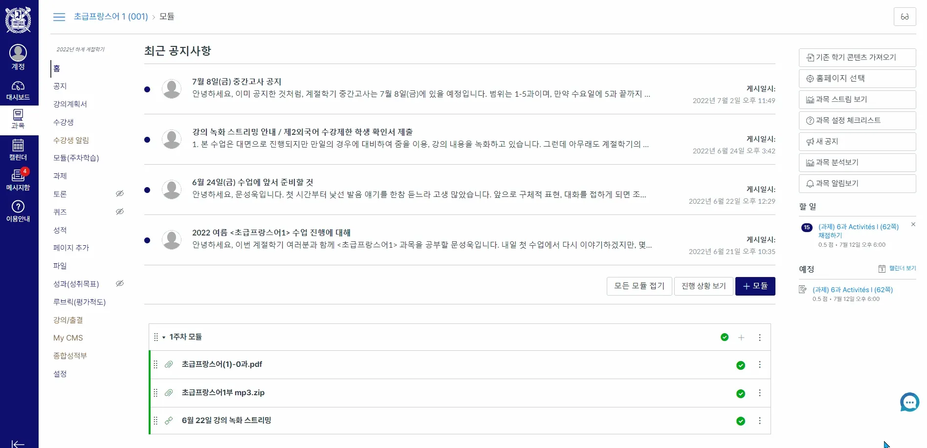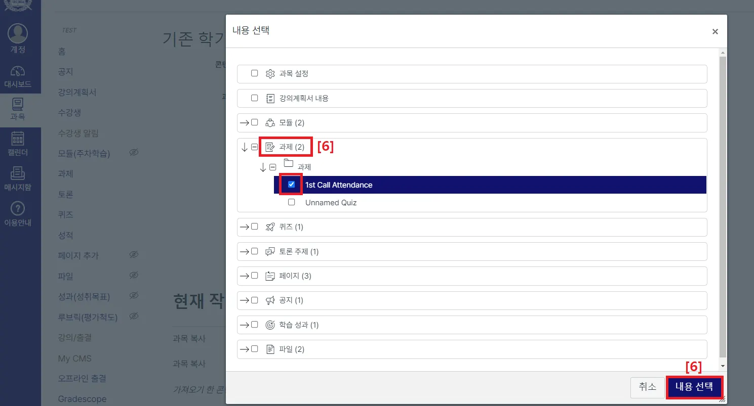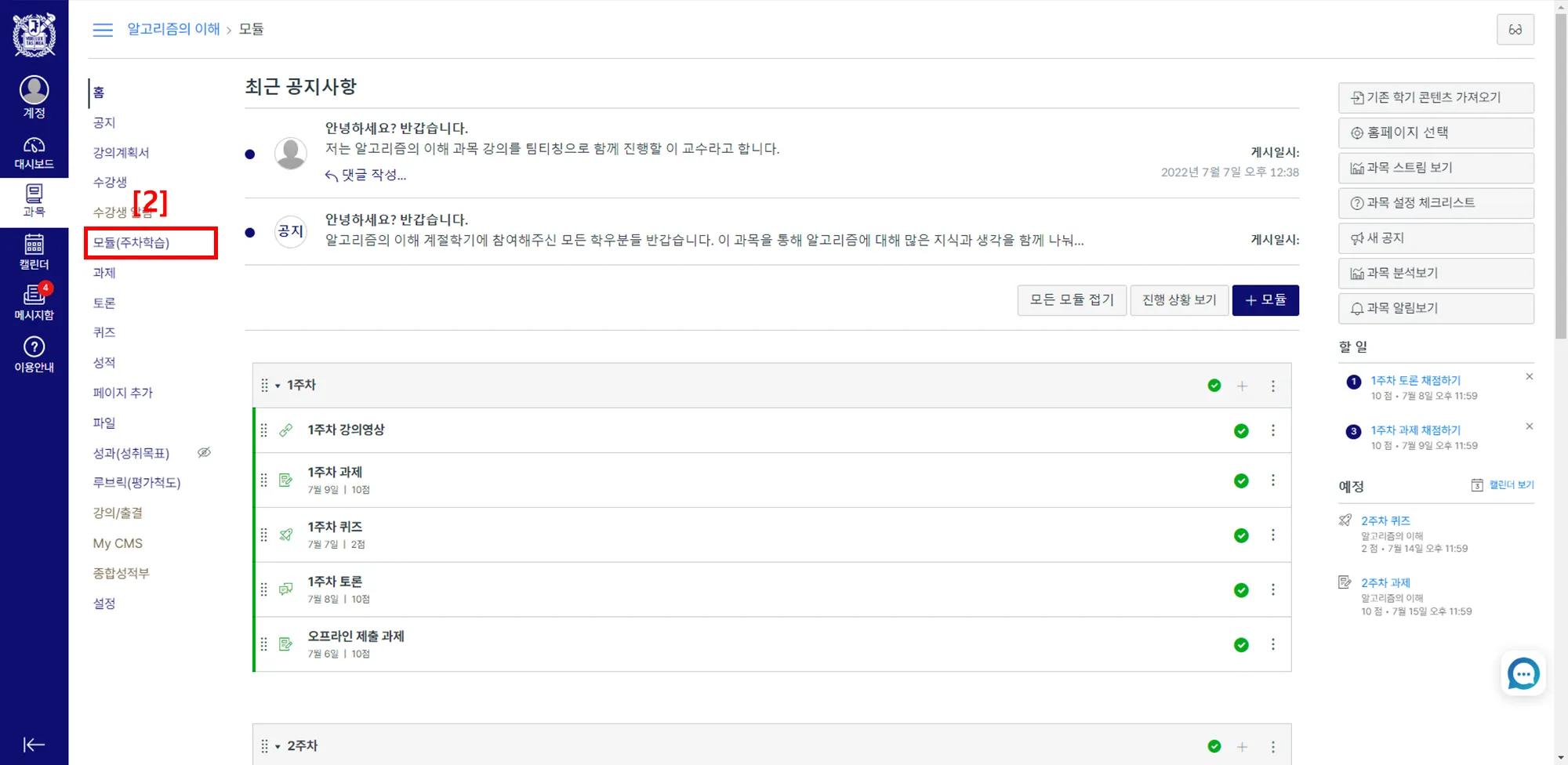 가져오기가 완료됩니다. [과제] 메뉴에서 가져오기 한 과제를 확인하실 수 있으며, 모듈(주차학습) 메뉴에 해당 과제를 추가할 수 있습니다.