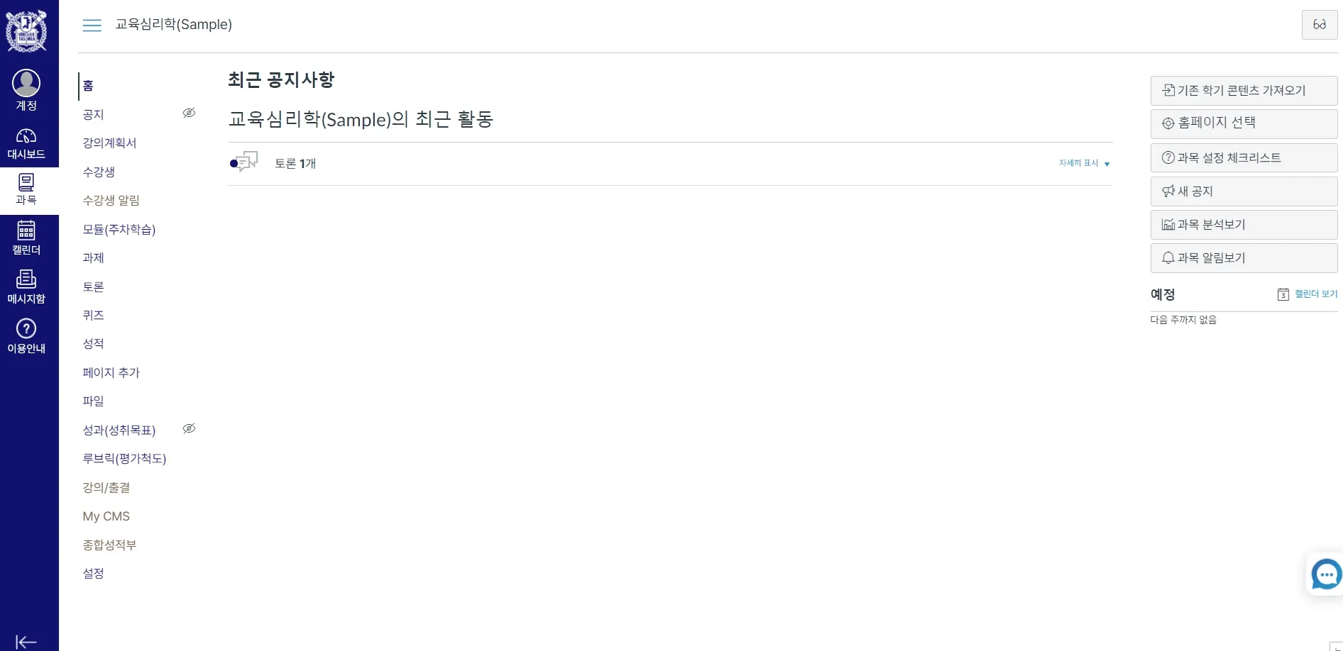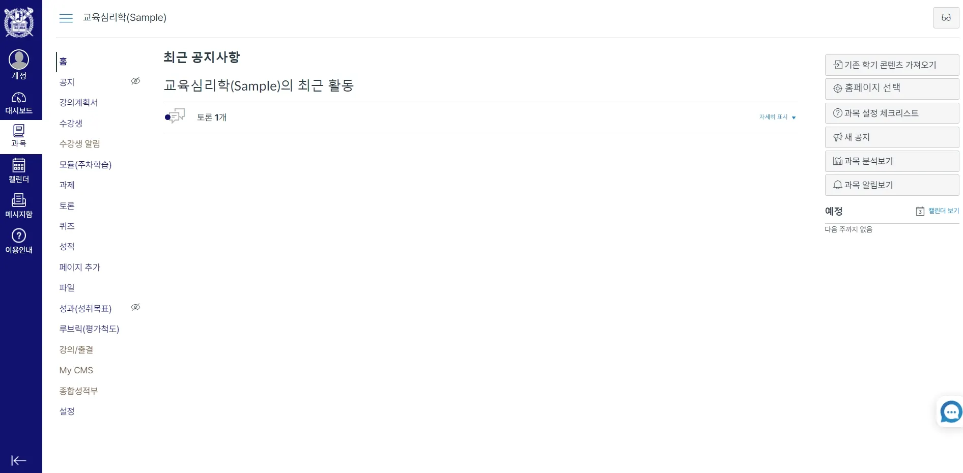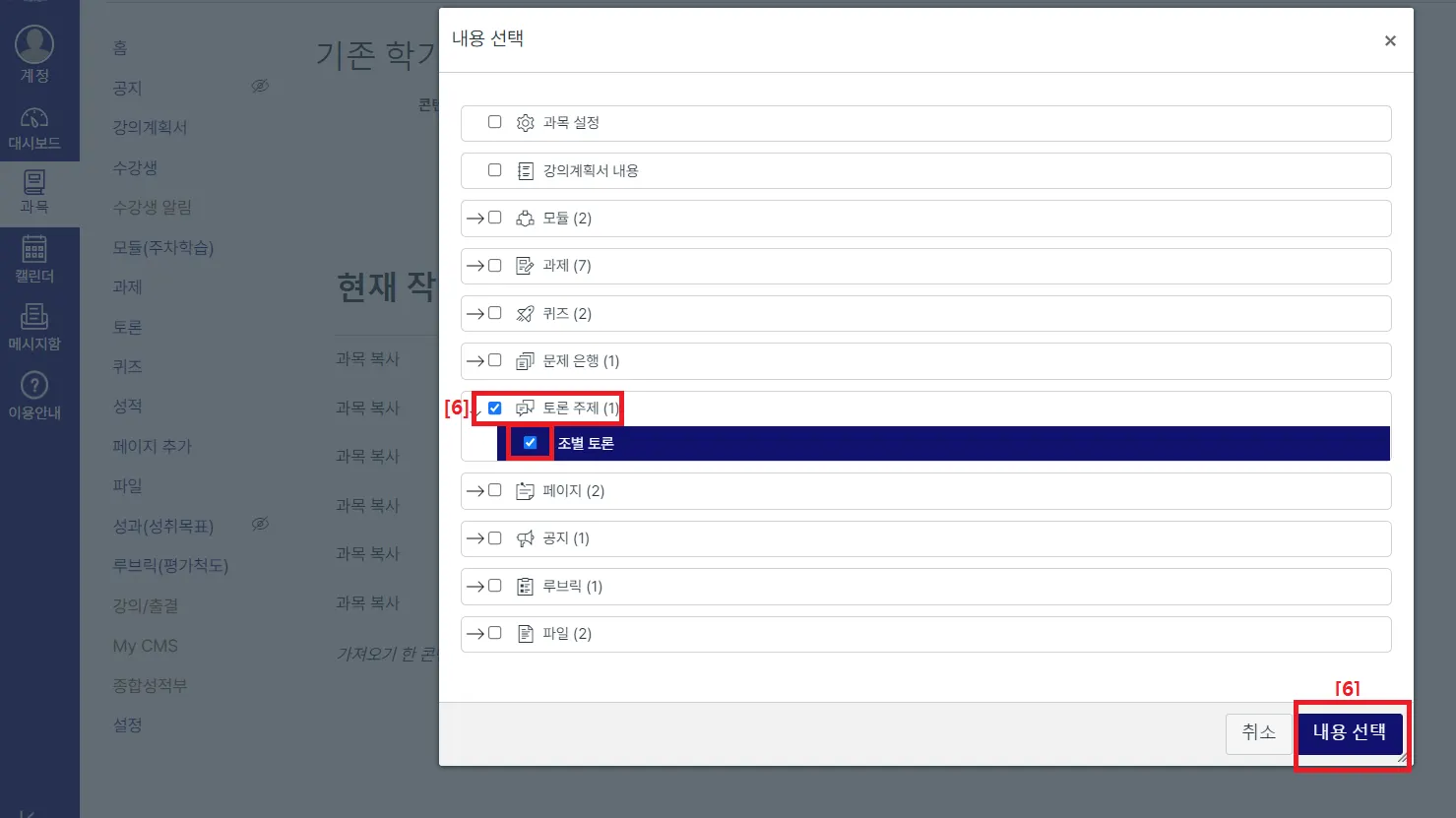 가져오기가 완료됩니다. [토론] 메뉴에서 가져오기 한 토론를 확인하실 수 있으며, 모듈(주차학습) 메뉴에 해당 토론을 추가할 수 있습니다.