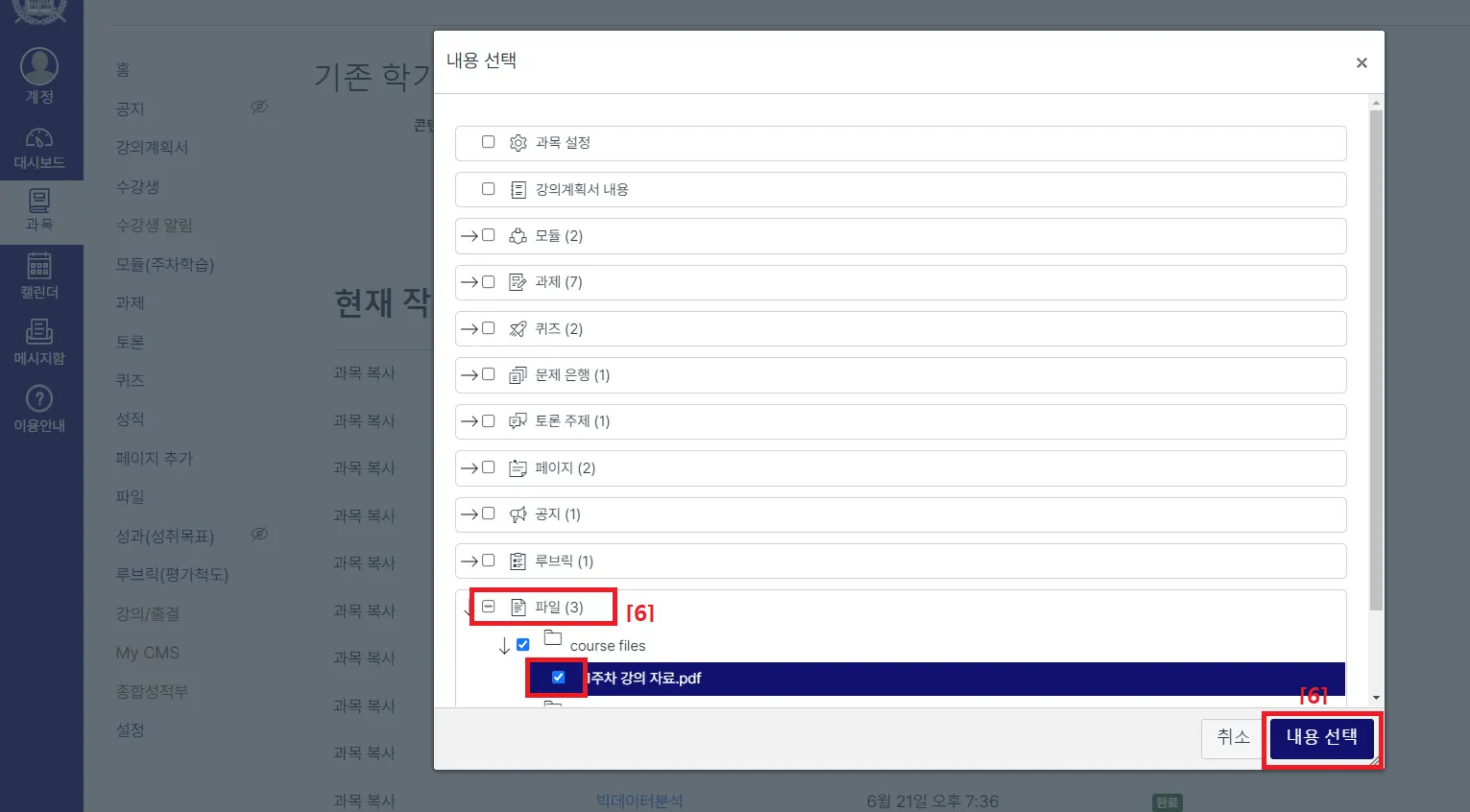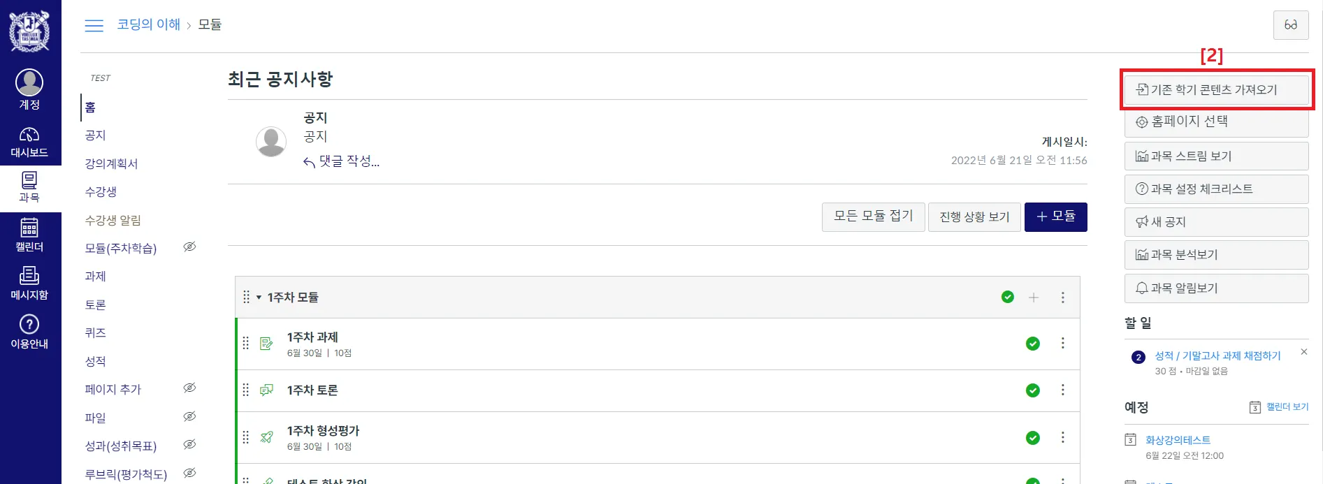 2022년 1학기 new eTL에서 시범 운영을 진행하셨던 교수님 중, [강의콘텐츠]에서 업로드한 동영상 혹은 [강의자료실]에서 업로드한 학습 자료를 신규 운영 과목에 가져오기를 원하시는 경우 하기 방법 참고 부탁드립니다. (과제, 토론, 퀴즈, 파일은 상기 방법대로 가져오기 하시면 됩니다.)