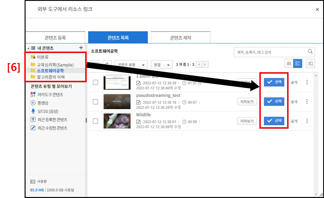 MyCMS 창이 팝업되고, 좌측 상단에는 담당하신 교과목별 폴더를 확인하실 수 있습니다. 폴더를 클릭하여 가져올 동영상을 검색한 후 원하는 동영상의 √ 선택 버튼을 클릭합니다.