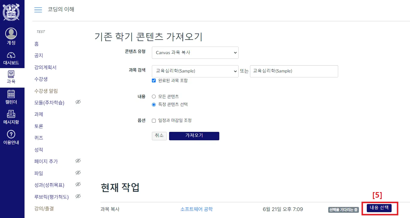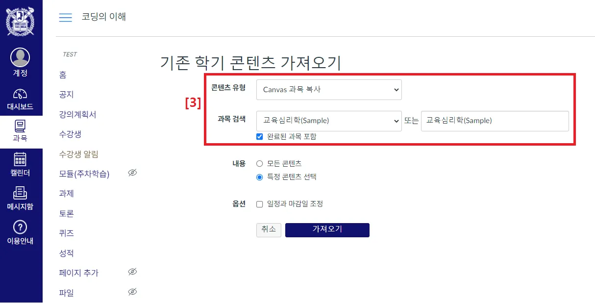 콘텐츠 유형에서 [Canvas 과목 복사]를 선택하고, 복사해 올 콘텐츠가 있는 과목을 검색 후 선택합니다.