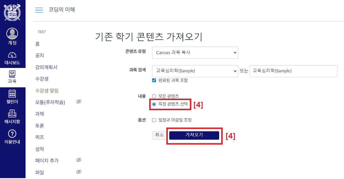 [특정 콘텐츠] 선택 후 하단의 [가져오기]를 클릭합니다.