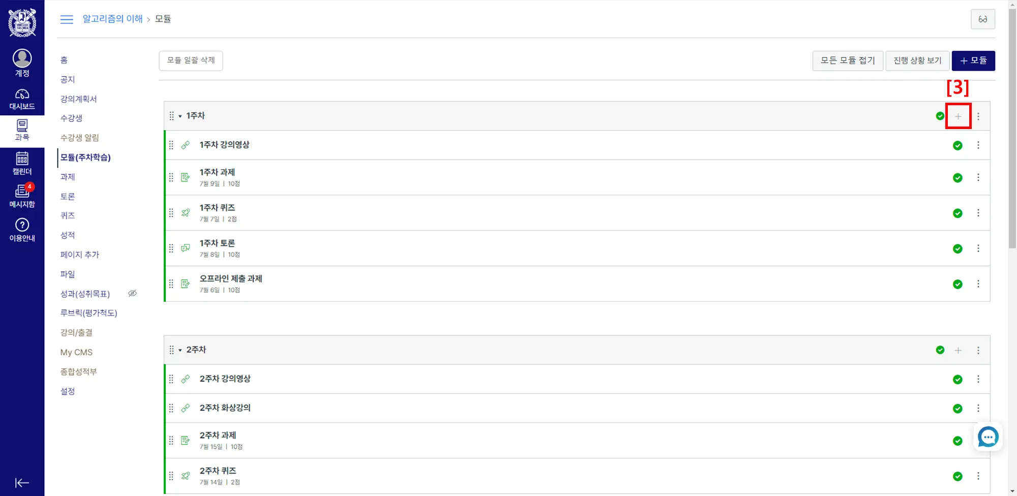 가져오기가 완료됩니다. [모듈(주차학습)] 메뉴에서 가져오기 한 주차 모듈을 확인하실 수 있습니다.