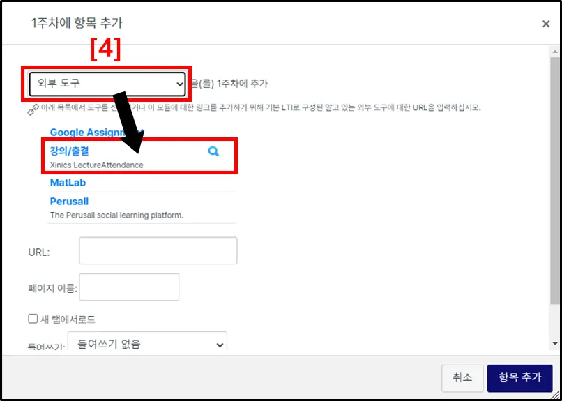 팝업된 추가창에서 [외부 도구] - [강의/출결] 순으로 클릭합니다.