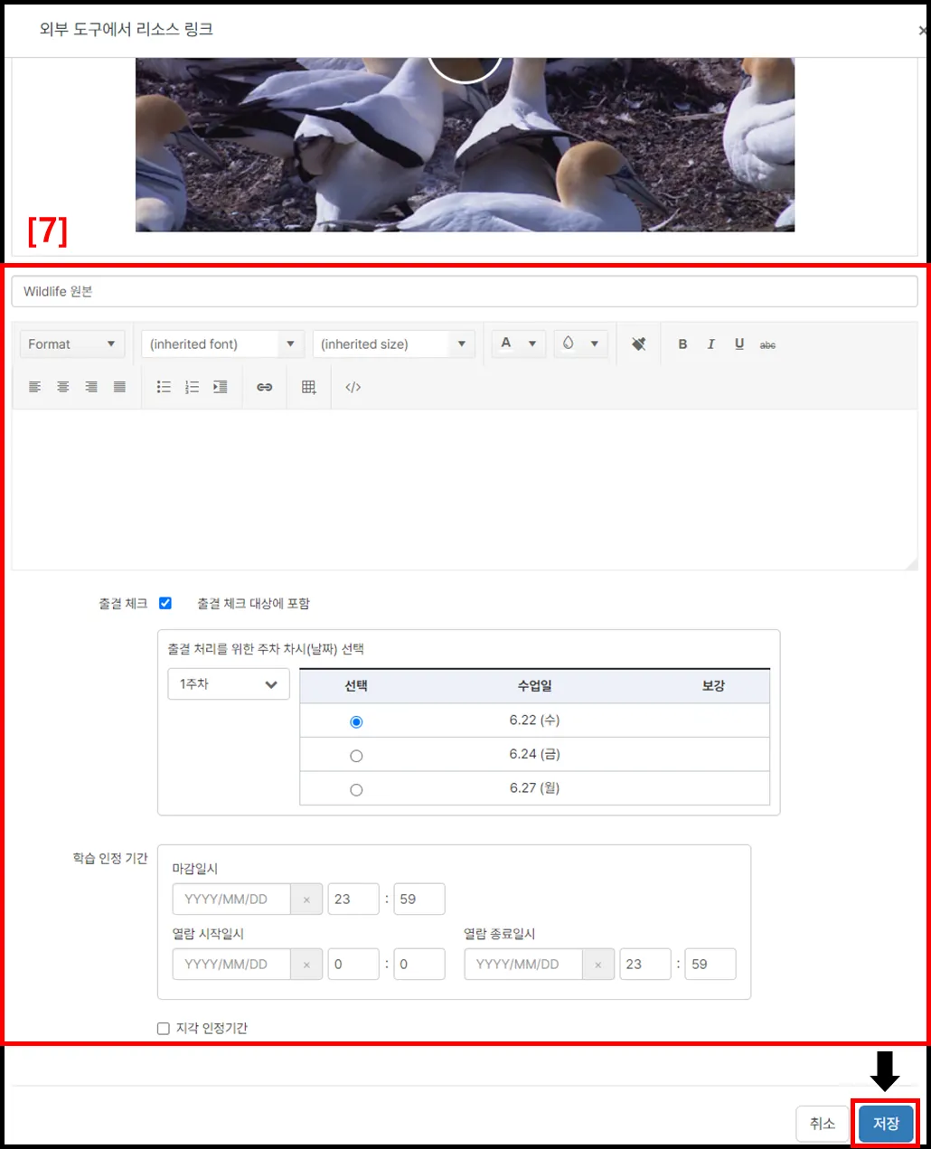 가져온 동영상의 이름과 설명을 입력합니다. 출결 체크 영상일 경우 출결 처리를 위한 주차 차시(날짜)를 선택합니다. 마지막으로 학습 인정 기간을 입력한 후 저장 버튼을 클릭합니다.