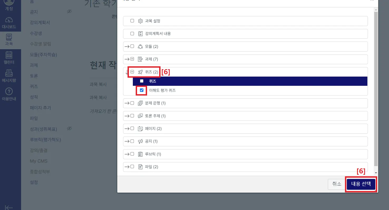 [퀴즈 > 원하는 퀴즈]를 선택하고 내용 선택을 클릭합니다.