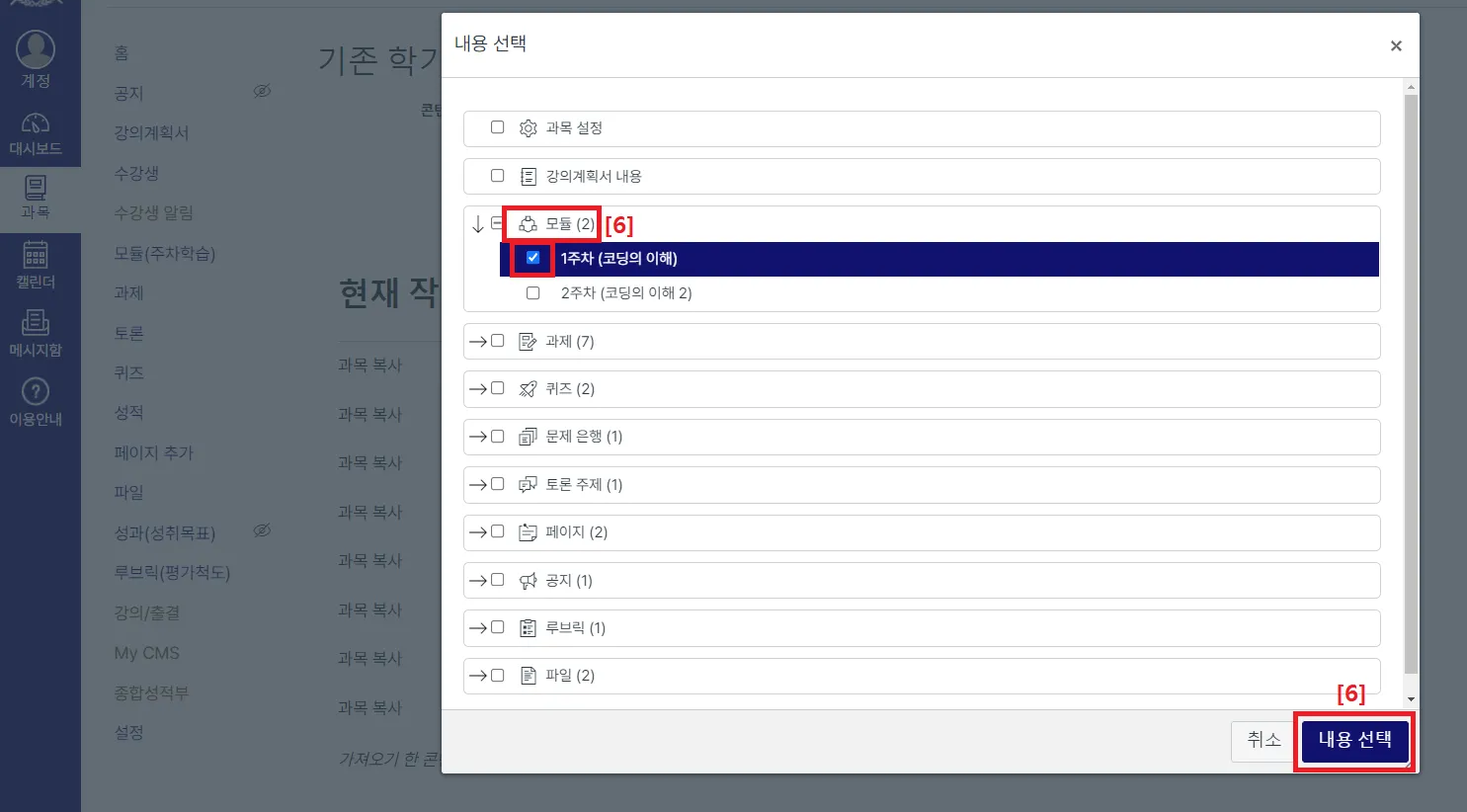 [모듈 > 원하는 모듈]을 선택하고 내용 선택을 클릭합니다.