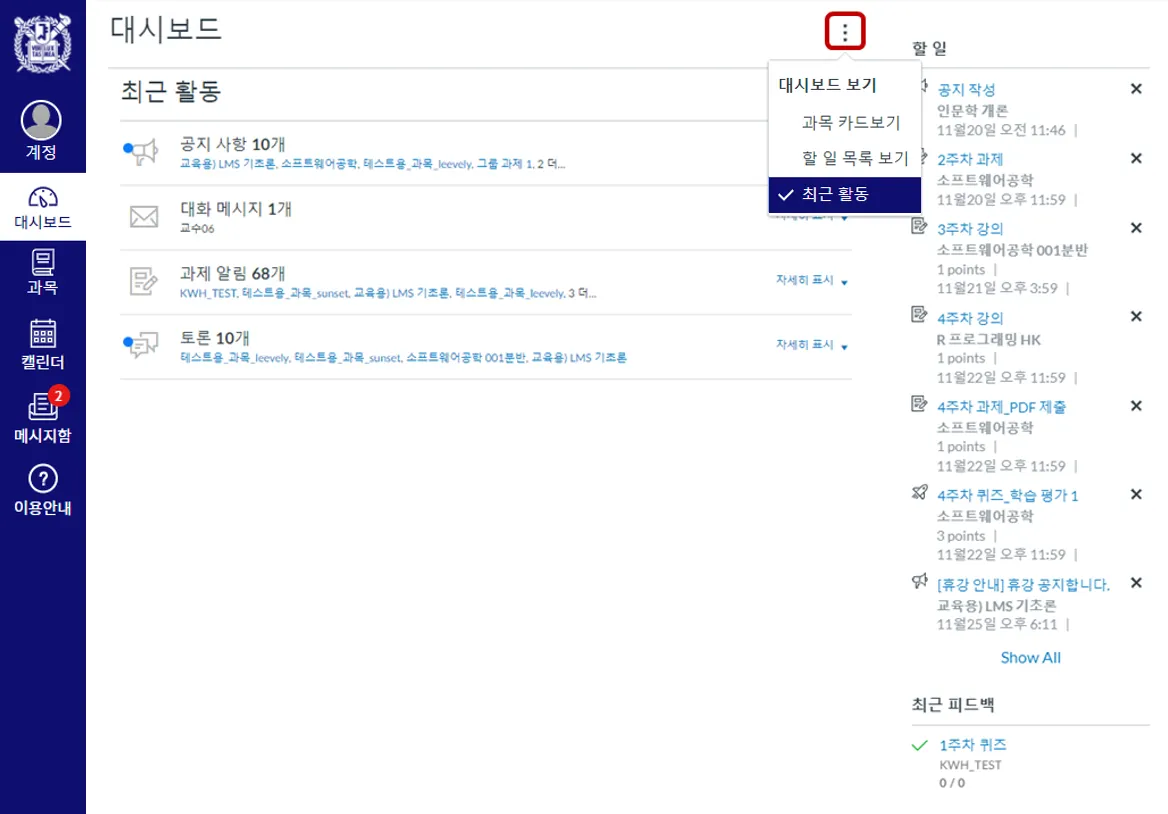 최근 활동 : 내 과목의 각 코너 별 최신 등록 글이나 알림을 모아볼 수 있습니다.