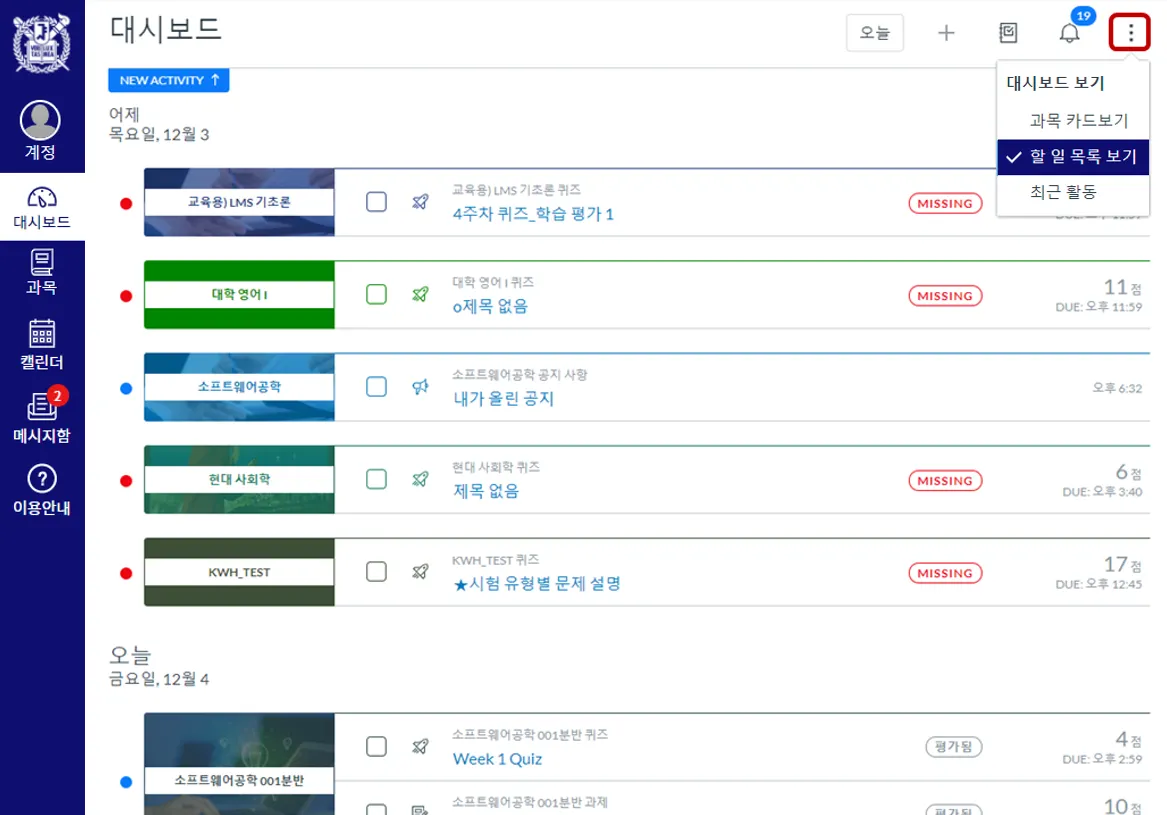 할 일 목록 보기 : 내 과목 활동을 날짜 별 목록으로 볼 수 있습니다.