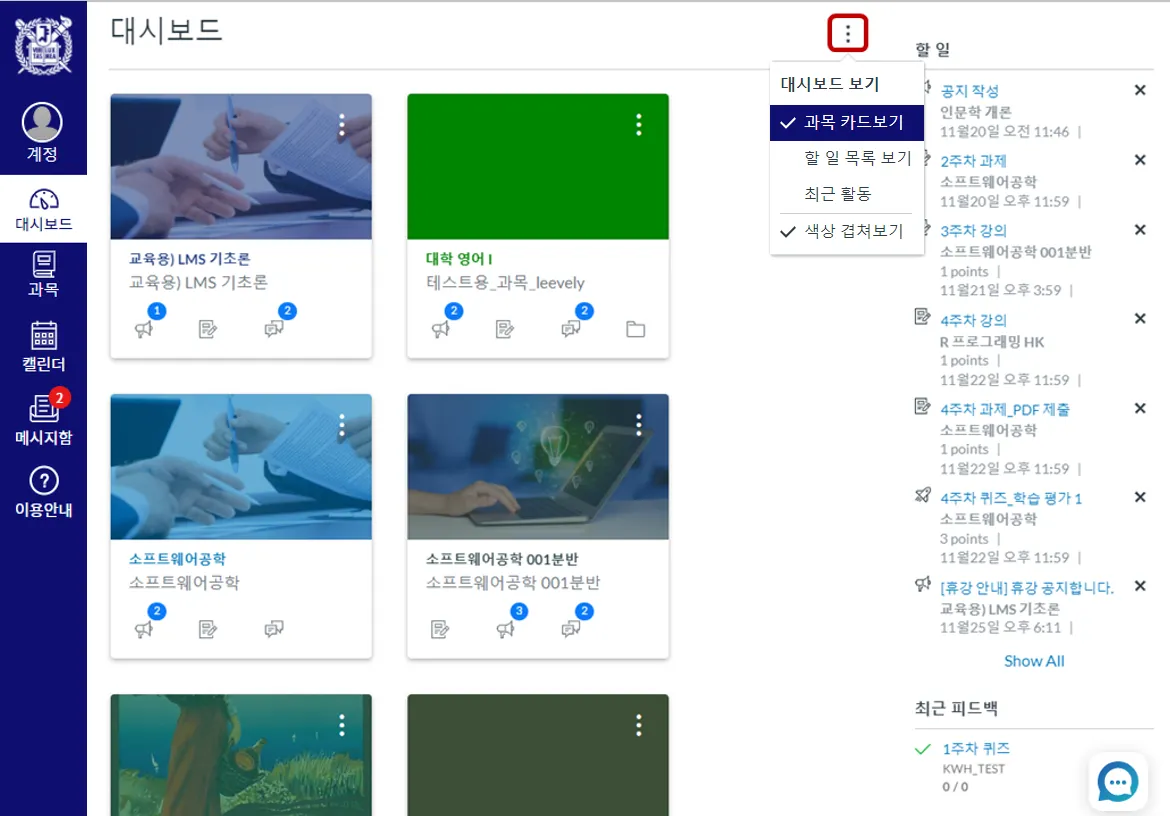 대시보드 형태를 ‘과목 카드 보기’ 형태와 ‘최근 활동’ 중 선택할 수 있습니다.