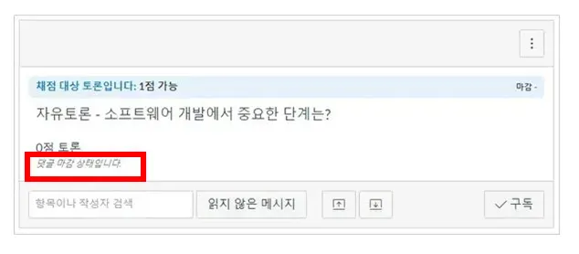 마감 날짜를 지정한 경우 마감일까지 토론에 참여하는 것을 권장하지만 마감일 이후에도 열람 종료일까지 토론에 참여할 수 있으며, 이 때 교수자에게는 지각 참여로 표시되어 평가 시 감점이 될 수 있습니다.