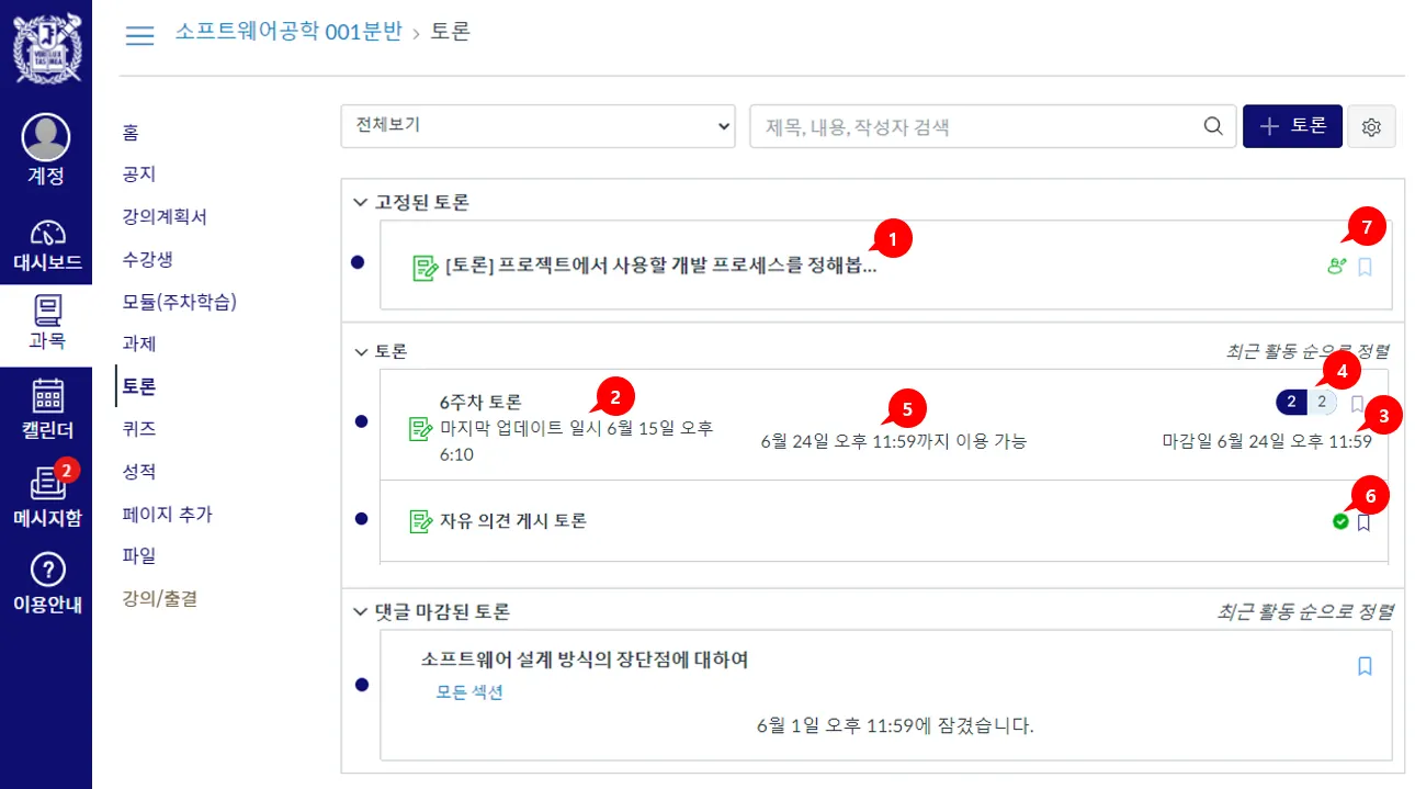 각 토론은 토론의 제목[1], 토론 게시물의 마지막 업데이트 날짜[2], 마감 날짜[3], 읽지 않은 댓글 수 / 토론의 총 댓글 수[4], 열람 종료일[5]이 표시됩니다.