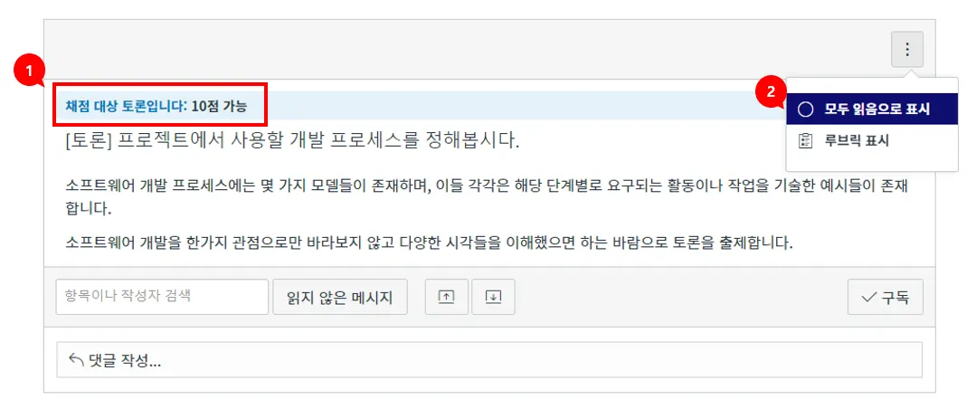 모두 읽음으로 표시 및 루브릭[2] : 교수자가 성적에 포함되는 채점 대상 토론을 제시하면서 루브릭 설정을 한 경우, 우측 상단의 [더 보기] 버튼(점 3개)을 눌러 ‘루브릭 표시’ 메뉴를 통해 설정된 루브릭을 확인할 수 있습니다.