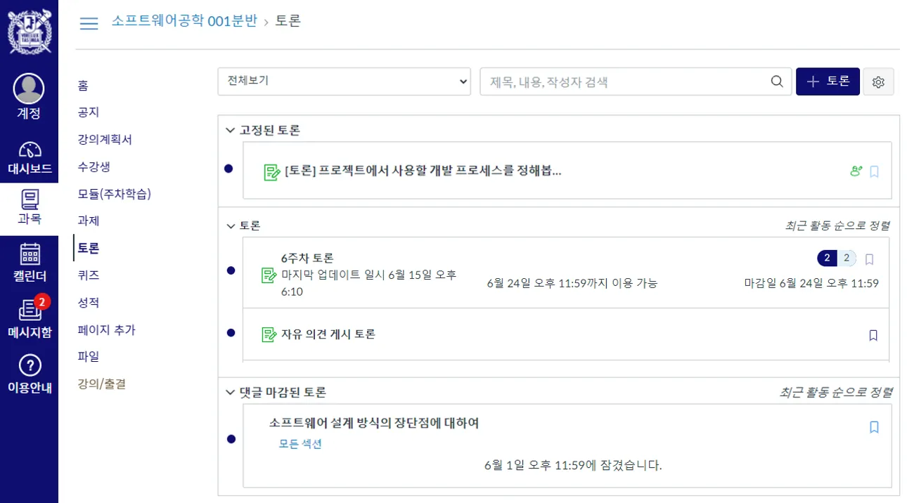 과목 메뉴에서 ‘토론’을 눌러 이동합니다.