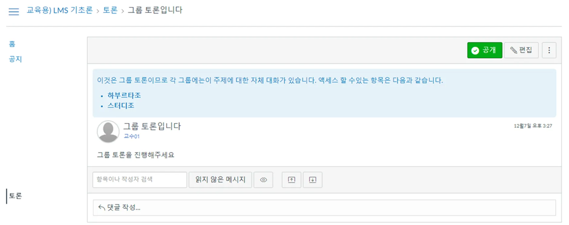 토론 학습 활동을 생성할 때 ‘그룹 토론’ 옵션을 체크하여 그룹(팀 프로젝트)안에서 그룹 구성원들끼리 진행하는 토론을 생성할 수 있습니다.