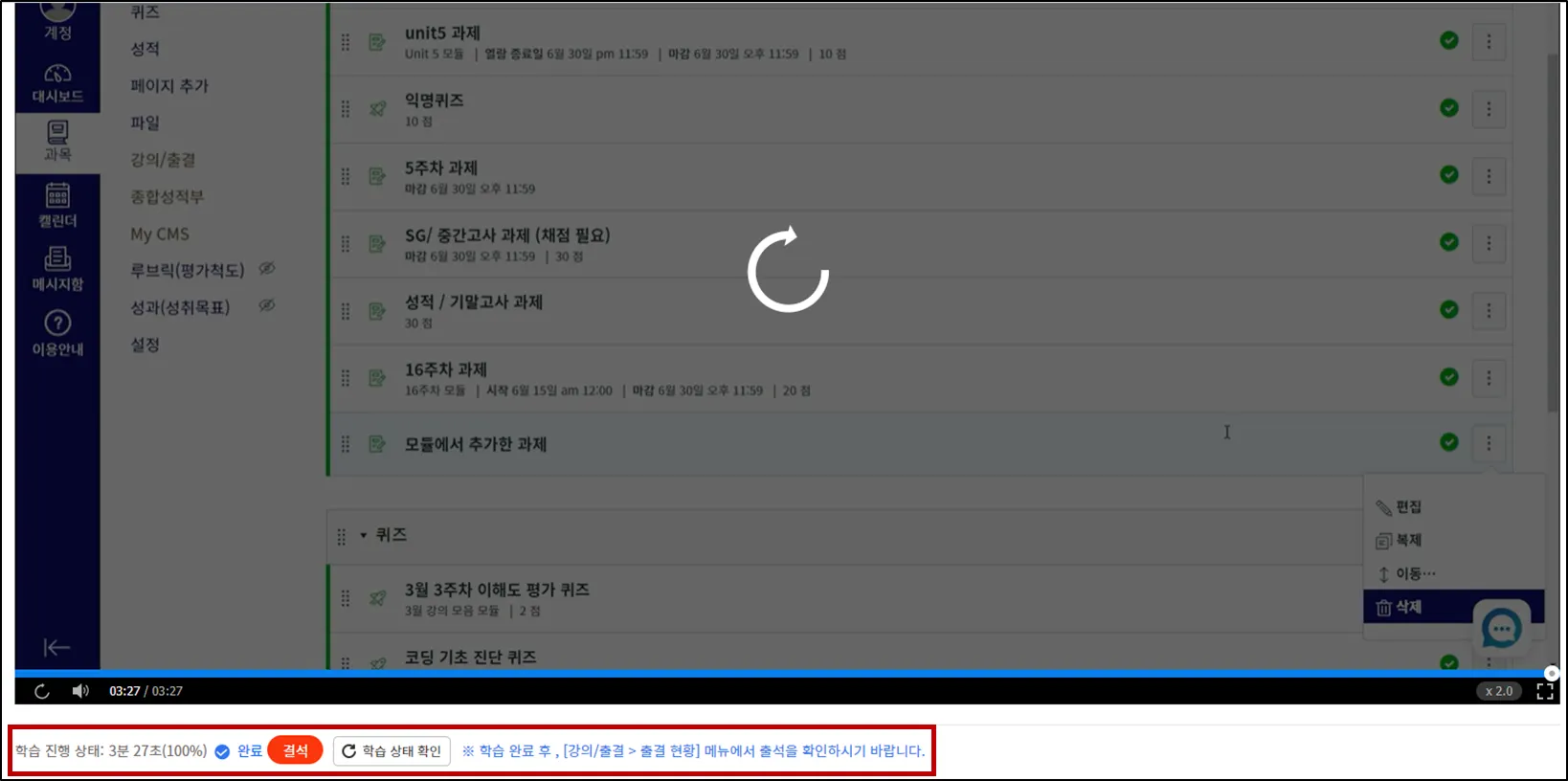 출결에 포함되는 동영상 강의는 영상 재생 시간의 90% 이상 시청해야 출석으로 인정됩니다.