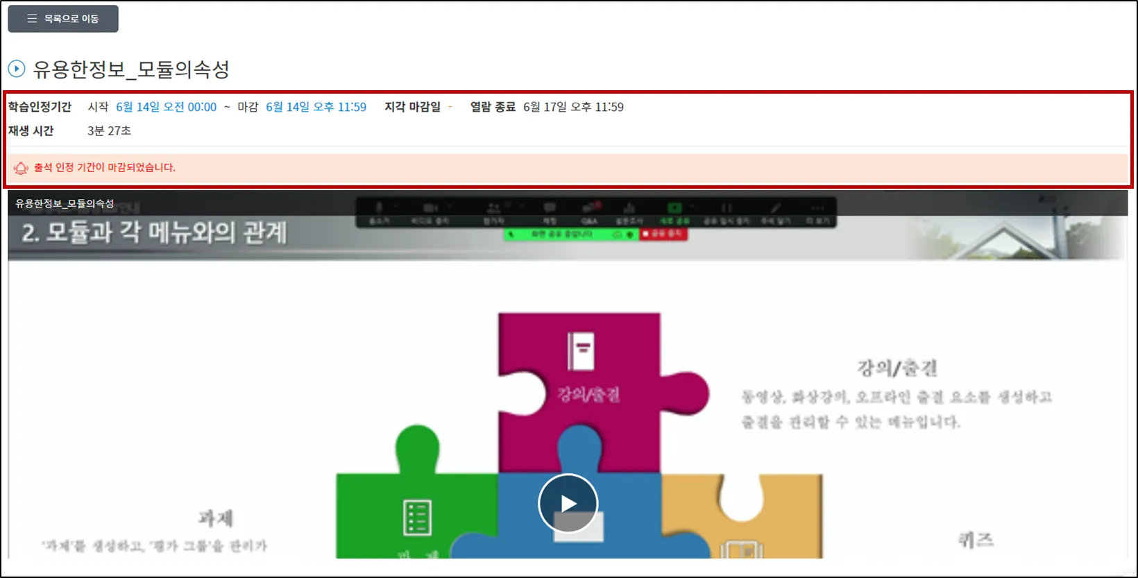 모듈 목차 중 강의 영상 항목을 선택하여 학습 화면으로 이동합니다.