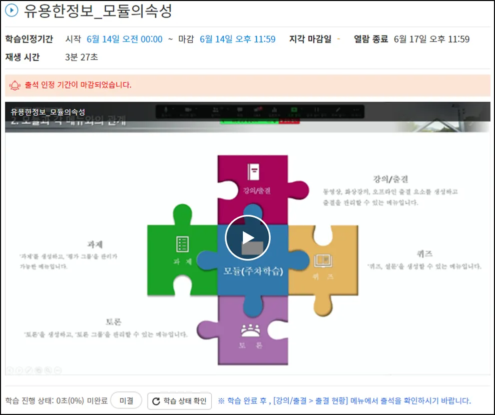 출석 : 출석 인정 기간 내 학습 인정 비율(90%) 이상 시청한 경우