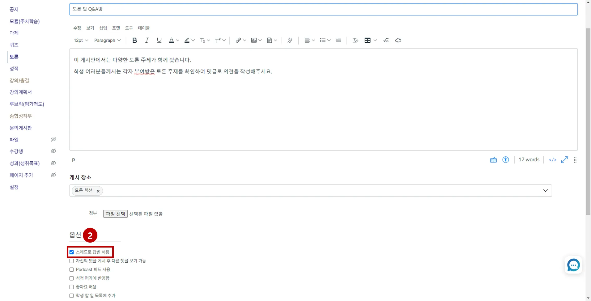 제목과 내용을 입력하신 후, 하단의 [옵션]에서 스레드로 답변 허용에 체크합니다.
