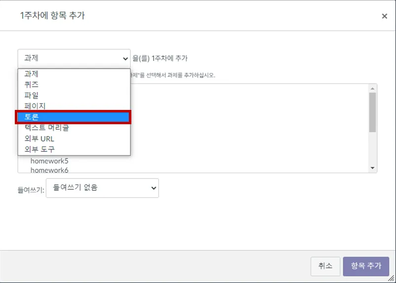 1-3. 추가 드롭다운 메뉴에서 ‘토론’ 유형을 선택합니다.
