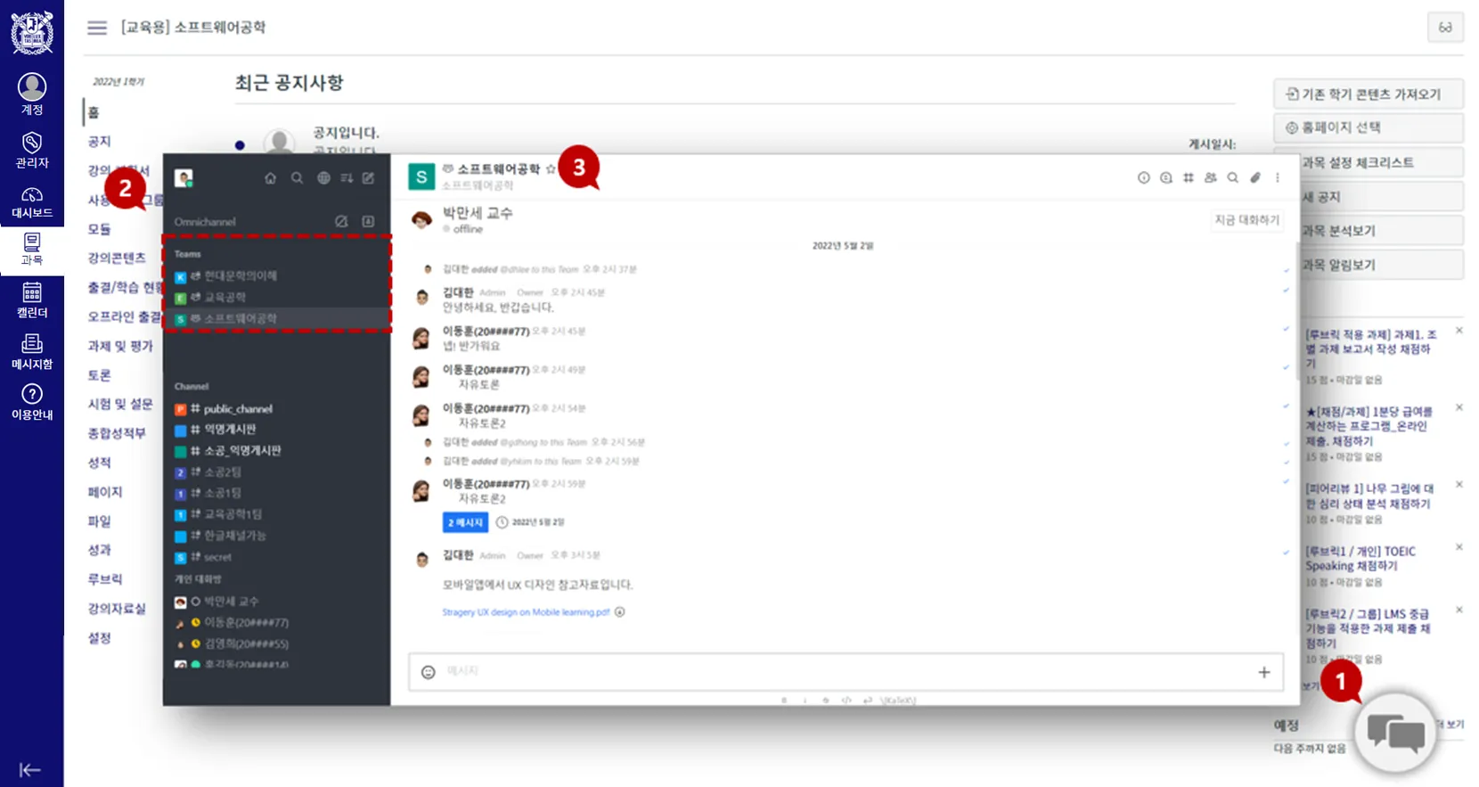 ③ 채팅 화면 : 해당 과목의 채팅방으로 이동하면 화면 가운데[3]에 채팅화면이 표시됩니다. 이 화면에서는 과목명과 교수자명, 채팅 구성원, 채팅 이력 등을 확인 할 수 있습니다.