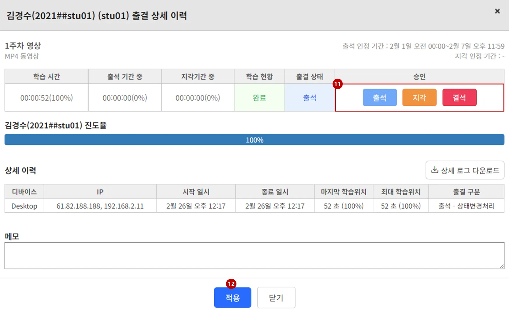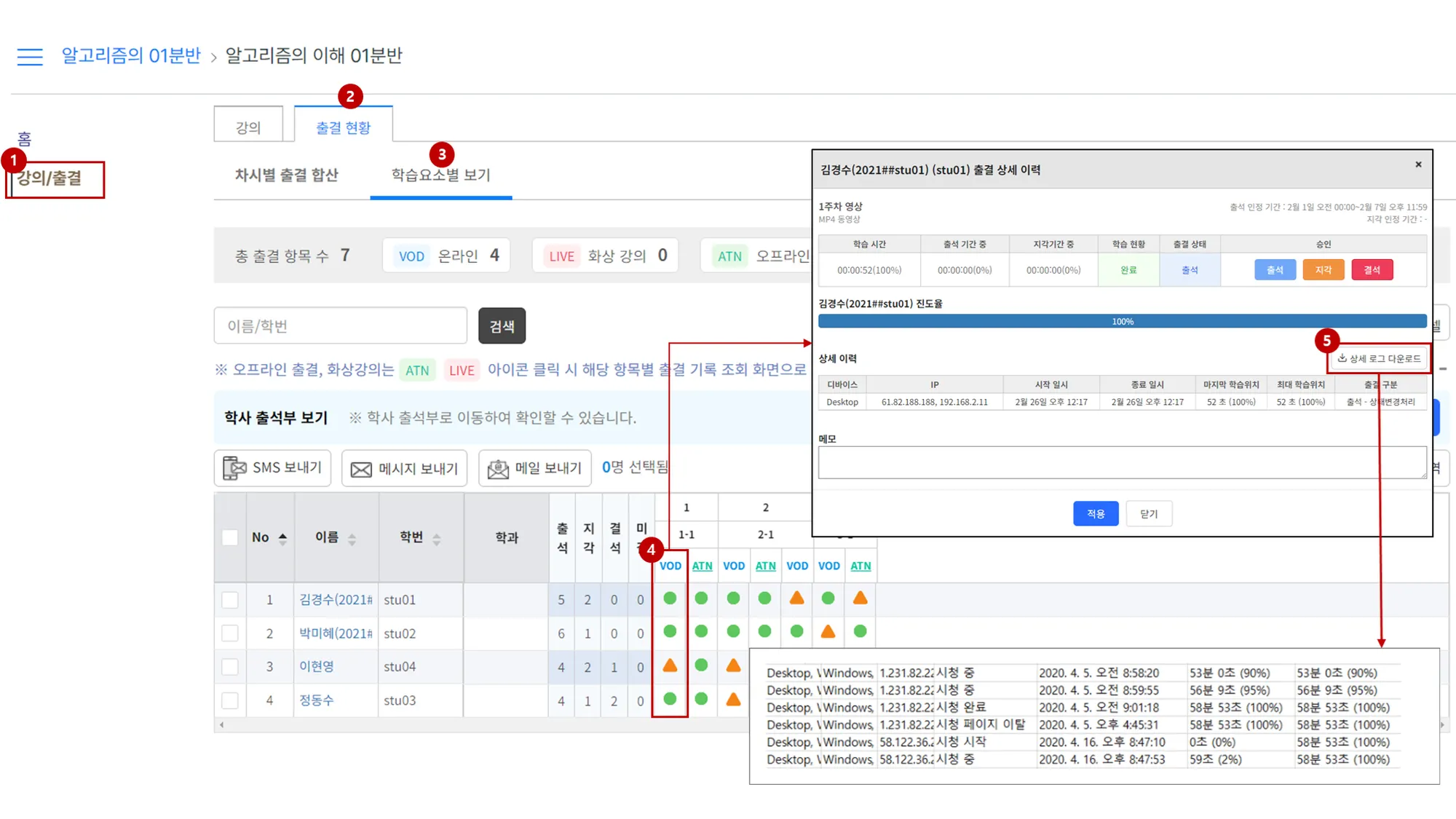 동영상별 출결 상세 로그를 확인합니다.