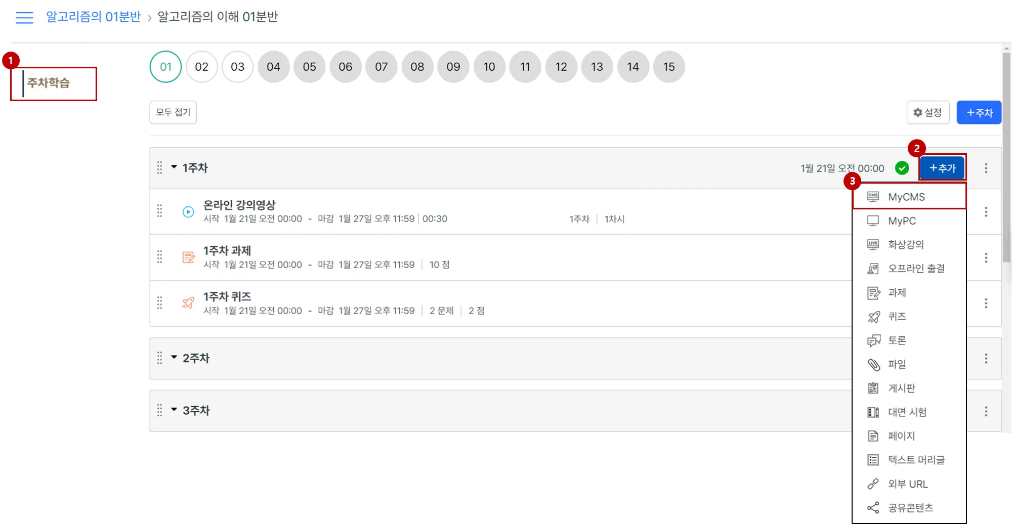 해당 주차의 [+ 추가] 버튼을 클릭합니다.