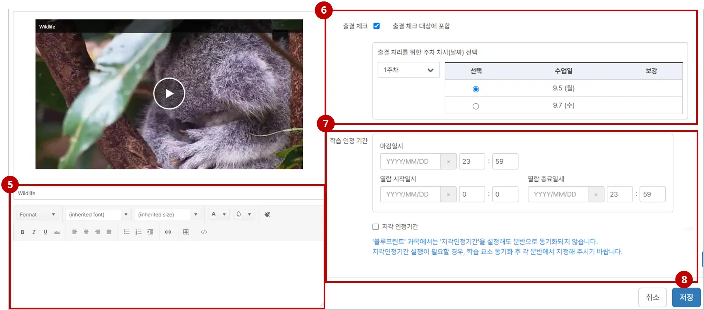 마감일시 : 학습요소의 학습을 마감하는 출석 마감 일시를 의미합니다.