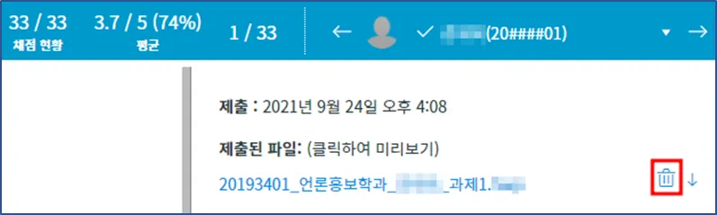 해당 과제에서 학습자가 제출한 과제물이 ‘다량이거나 개별 파일 용량’이 크기 때문에 다운로드 멈춤 현상