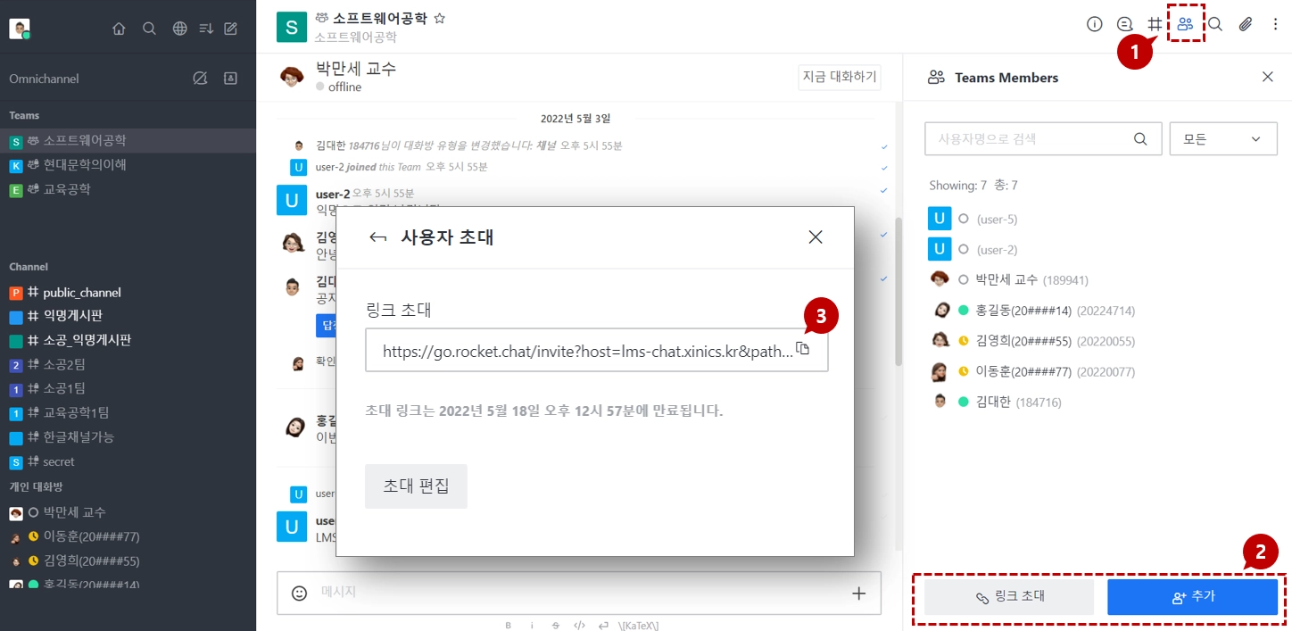 또는 링크 초대[2]를 클릭하면 해당 채팅방의 링크를 확인할 수 있습니다. 이 채팅방 초대 링크[3]를 복사하여 초대하고 싶은 사람에게 공유하면 이 링크를 통해 채팅방에 입장할 수 있습니다.