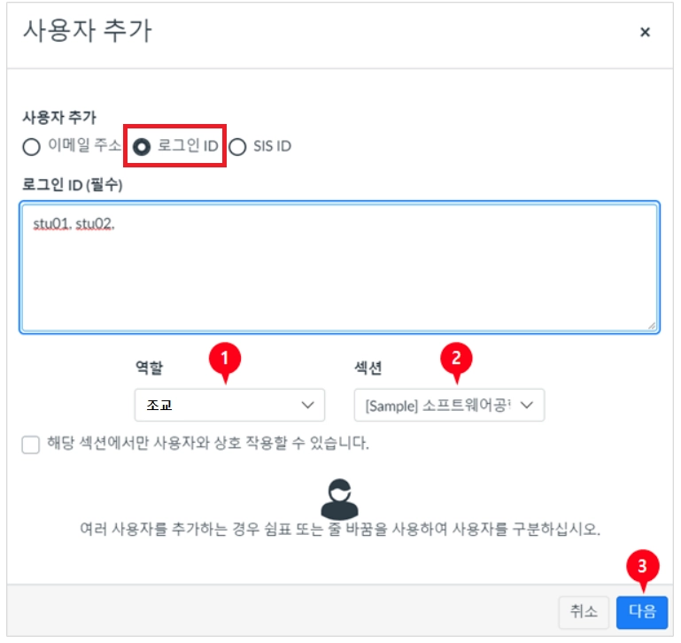 ① 역할 항목[1]에서 사용 가능한 역할에 따라 과목 내 역할을 지정합니다. (조교/학생 등)