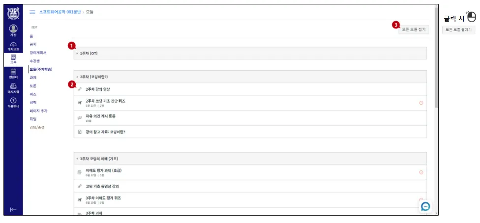 우측 상단의 모든 모듈 접기[3]를 클릭하면 모듈(주차) 목록만 남기고 학습요소를 모두 접어서
