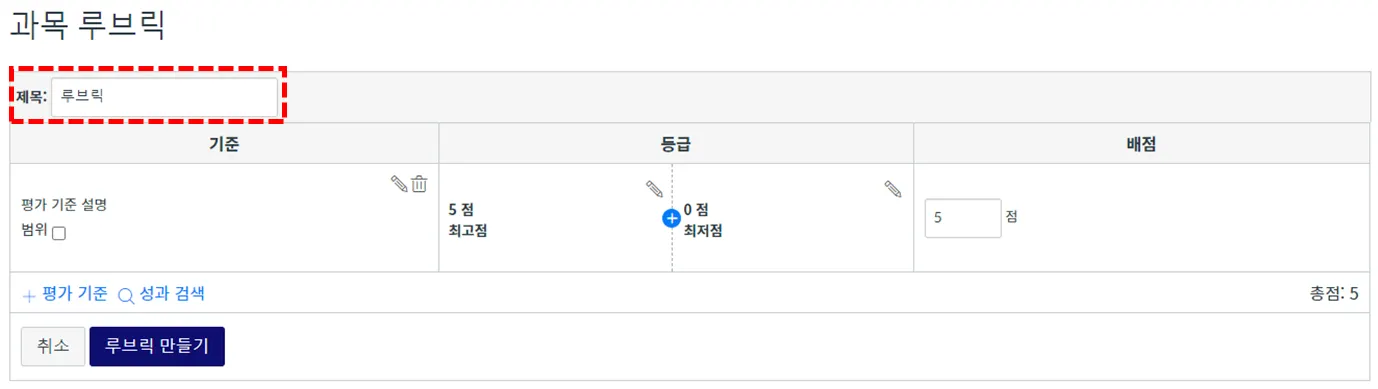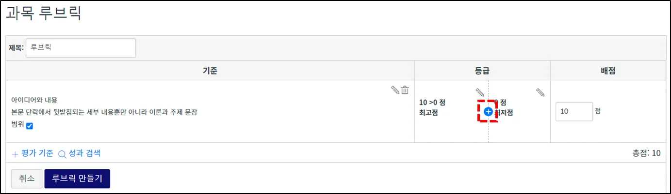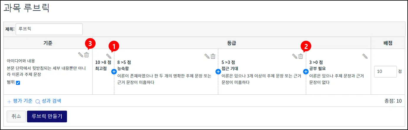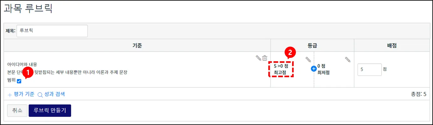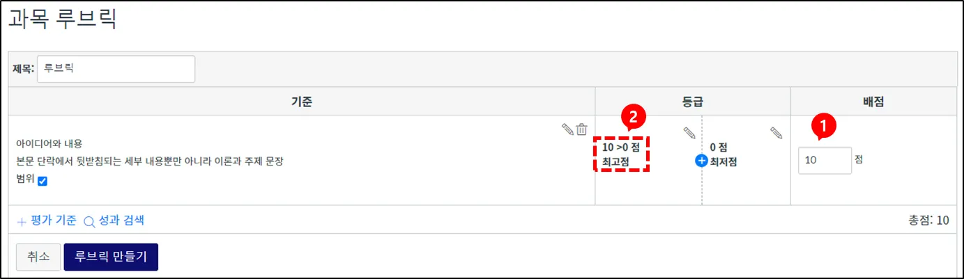 [참고] : 점수 범위 및 개별 점수값은 루브릭에 추가 된 후에는 다시 정렬 할 수 없습니다.