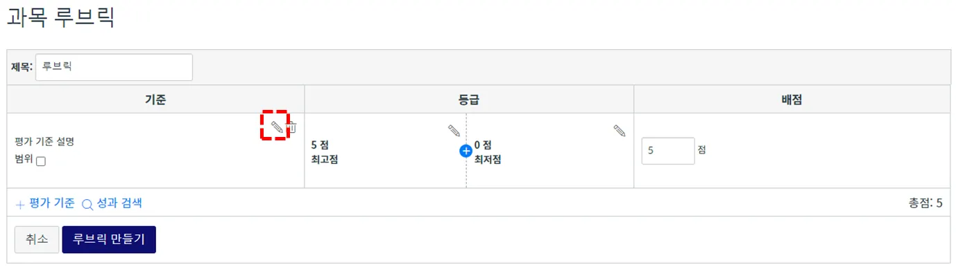 루브릭에는 하나의 기본 기준 항목이 포함됩니다. 기준 설명을 편집하려면 연필 모양의 편집 아이콘을 눌러 내용을 작성합니다.