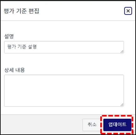 설명 입력란[1]에 기준에 대한 간단한 설명을 입력합니다. 기준에 더 긴 설명을 추가하려면 상세 내용[2]을 입력하십시오. 더 긴 설명은 학생들에게 기준에 대한 더 많은 정보를 제공합니다. [업데이트] 버튼[3]을 눌러 평가 기준 편집을 완료하고 저장합니다.