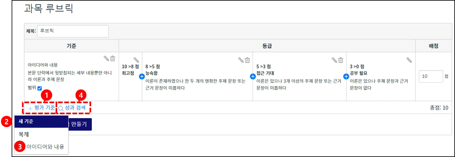 [참고 사항] : 기본 기준 항목은 루브릭에 추가된 후에는 다시 정렬할 수 없습니다. 따라서 특정 순서로 기준을 표시하려면 원하는 순서로 기준을 만들어야 합니다.