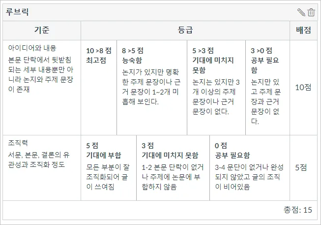 루브릭 등급은 기본적으로 5점을 두고 있으며, 최고점 루브릭을 5점, 최저점일 경우 0점을 부여합니다.