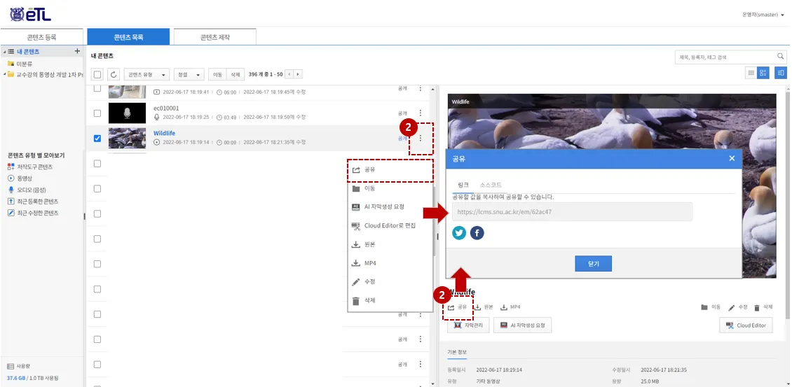 1-2. 업로드할 콘텐츠 우측의 ‘더 보기 버튼’ 선택 > ‘공유’ 메뉴를 클릭하거나, 미리보기 화면 하단의 ‘공유’ 버튼을 선택합니다.