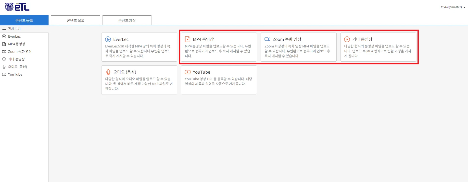 Mp4 동영상, Zoom 녹화 영상: 무변환으로 등록되어 업로드 후 즉시 학습자가 시청할 수 있습니다.