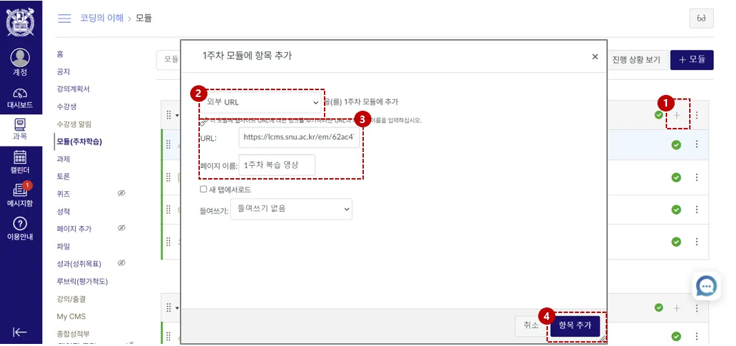 Step2. New eTL 모듈(주차학습) 메뉴에 복사한 링크 업로드하기