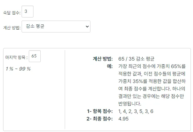 성과의 계산 방법으로 ‘감소 평균(Decaying Average), n 횟수, 가장 최근 점수 및 가장 높은 점수'의 네 가지 계산 방법 중 하나를 설정할 수 있습니다.