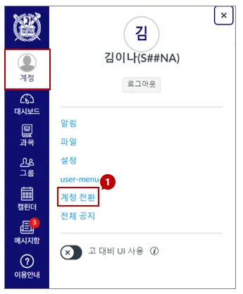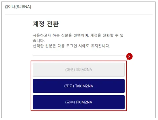 복수신분자 (ex. 조교, 대학원생 등 복수 신분을 동시에 가진 사용자)는 로그인 계정을 수강에 필요한 계정으로 선택할 수 있습니다.