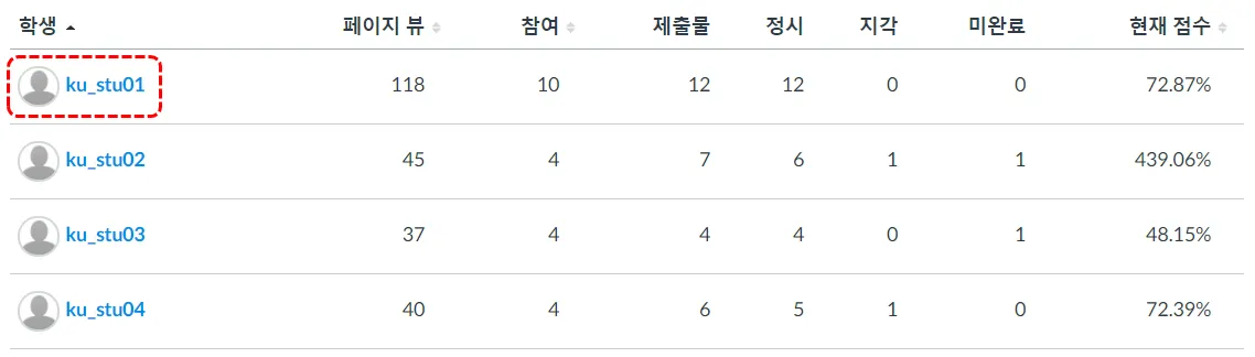 이 권한을 사용하면 교수자가 보는 학생 분석 통계 보기와 학생 자신이 보는 분석 통계 보기는 동일하게 표시됩니다.