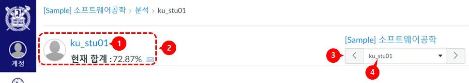 다른 학생의 분석을 보려면 사용자 메뉴에서 좌우 화살표 모양의 다음 또는 이전 버튼[3]을 누르거나, 드롭 다운 메뉴[4]에서 다른 학생을 찾아 선택합니다.