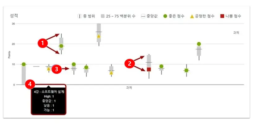 성적 그래프는 각 과제에 대한 중간, 높음, 낮음 점수를 보여줍니다.