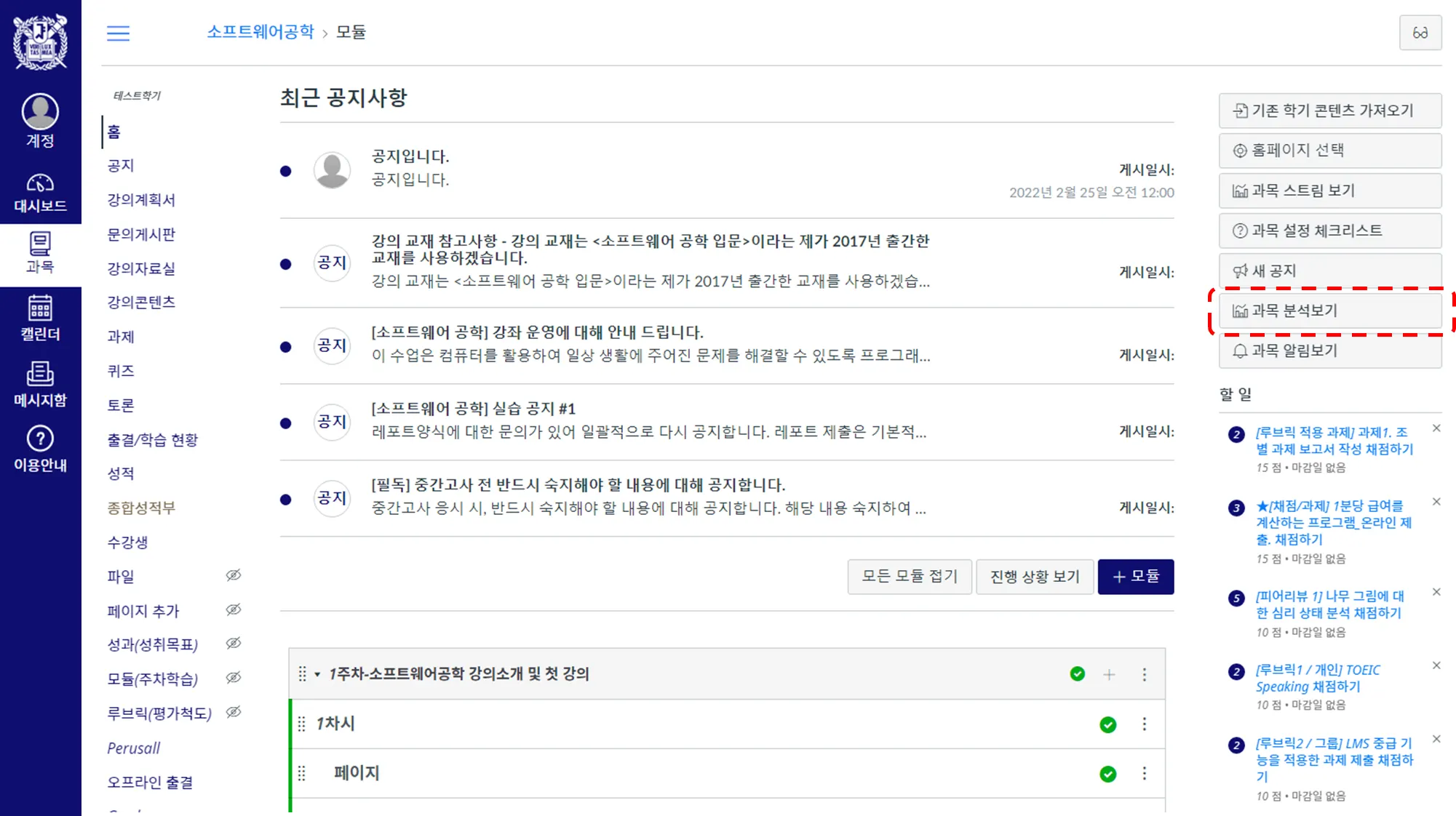 과목 분석을 보는 것은 코스 설정 상에 허용 되어 있어야 가능합니다. 과목 분석을 볼 수 없는 경우는 운영자가 기능을 제한한 경우입니다.