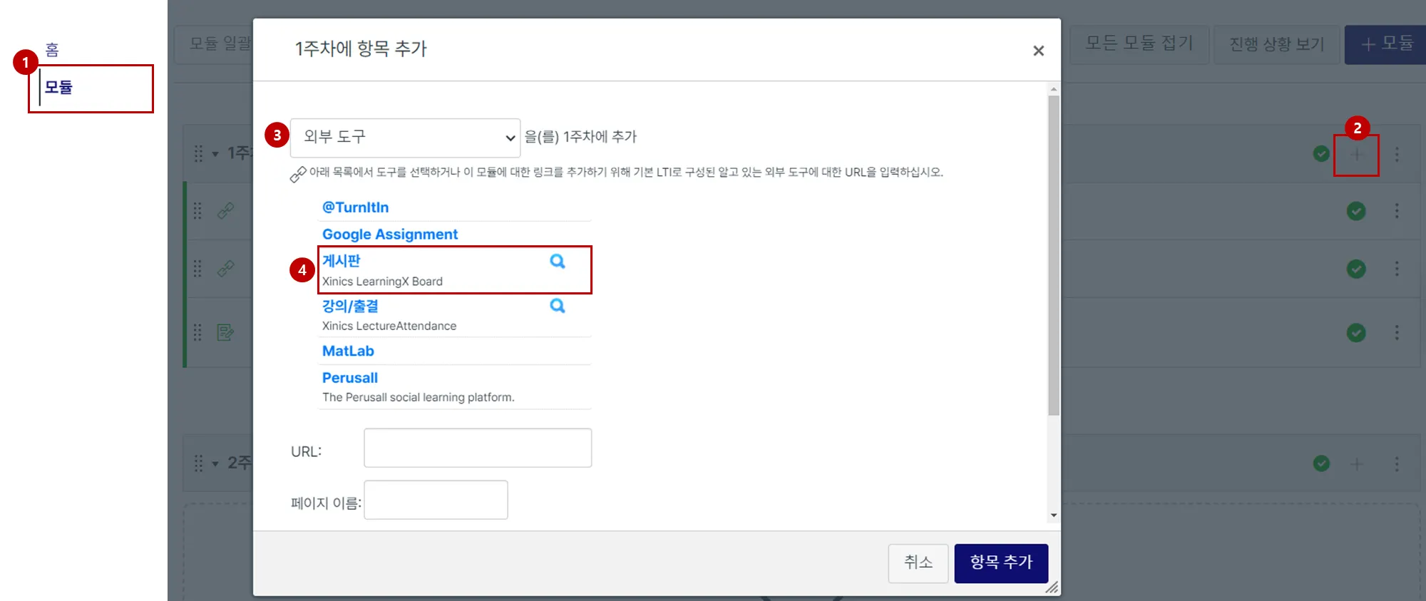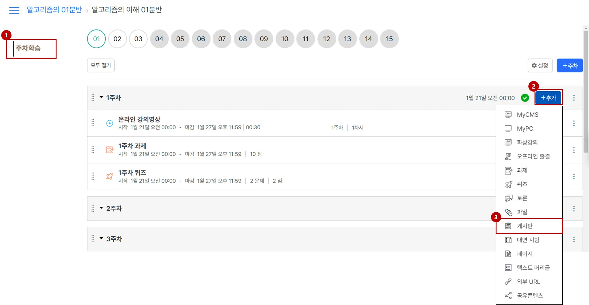 게시판을 추가할 주차의 오른쪽 상단 [+ 추가] 버튼을 클릭합니다.