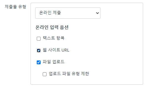 제출물 유형 드롭 다운 메뉴에서 과제에 대한 제출 유형을 선택합니다. 기본적으로 제출 유형은 온라인으로 설정되어 있습니다.