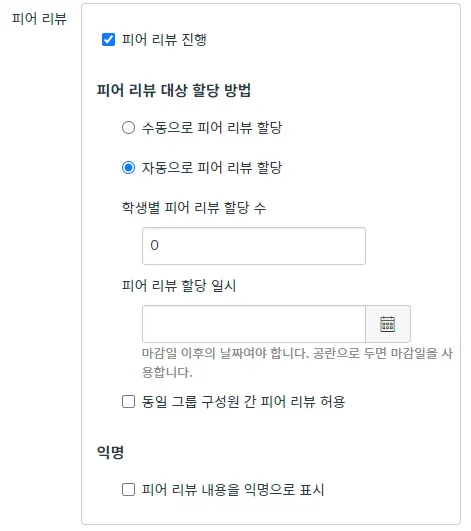 학생들이 서로의 과제를 검토하고 피드백 하도록 피어 리뷰 과제를 생성하려면 '피어 리뷰 진행' 항목을 체크합니다.